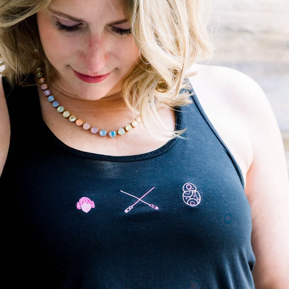 The Pink Galaxy Embroidered Tank is the perfect blend of playful and elevated, featuring three pink embroidered galaxy-inspired icons on a soft, flowy black tank.